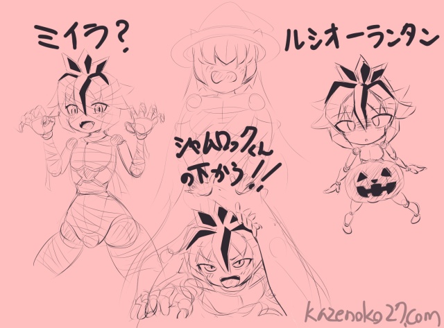 ルシオくんはカボチャパンツ?を引き当ててしまい、あまりの恥ずかしさに↓のような表情に…。ミイラコスなら参加できたかも…?が、まとまらず没になりました。ごめんよ!